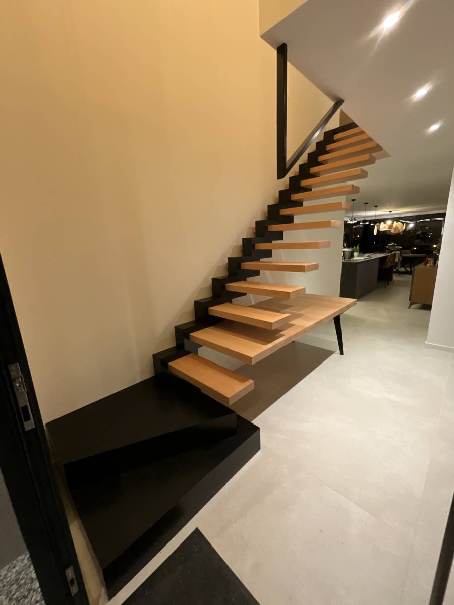 S2P a conçu et réalisé un escalier autoportant avec limon déporté et marches suspendues en hêtre pour une maison d'architecte à Villette d'Anthon, offrant légèreté et robustesse.