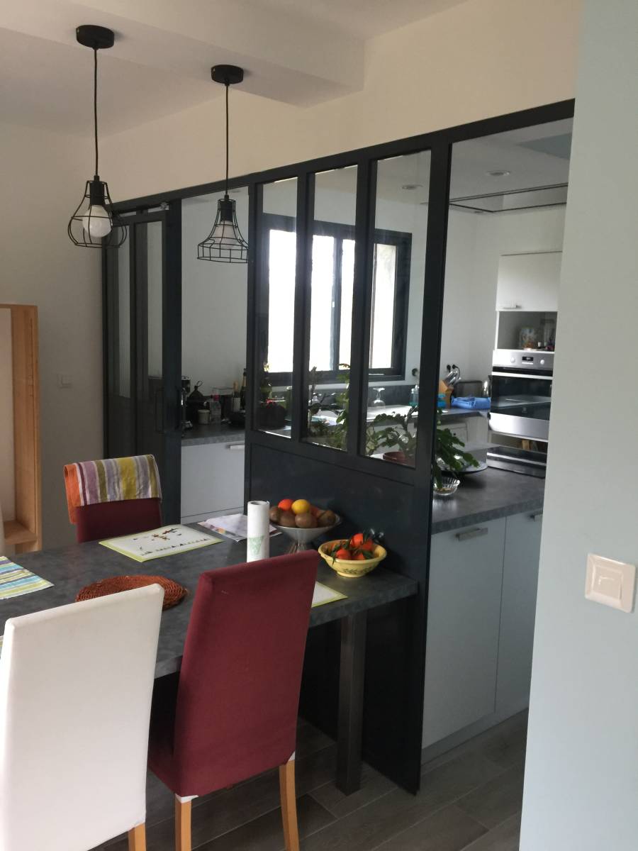 Conception et installation d’une verrière type atelier en acier thermolaqué avec des profils RP Technik à Neuville-sur-Saône, dans l’agglomération lyonnaise, offrant une séparation élégante et robuste entre l’espace cuisine et l’espace repas, tout en apportant une touche industrielle.