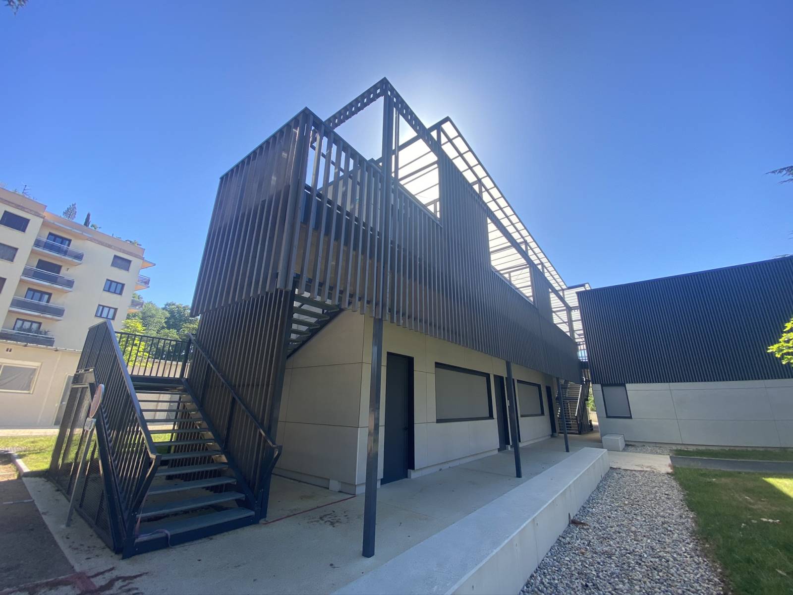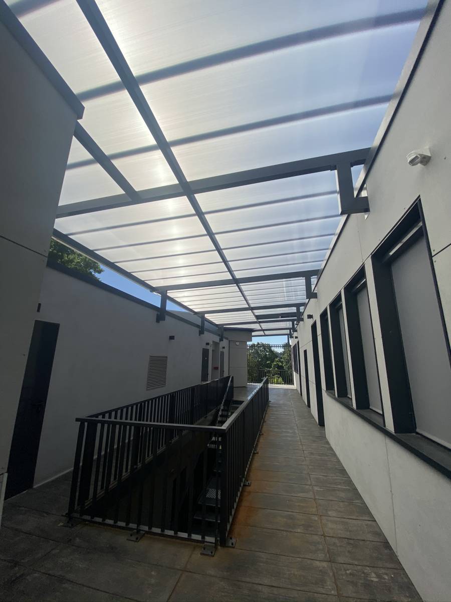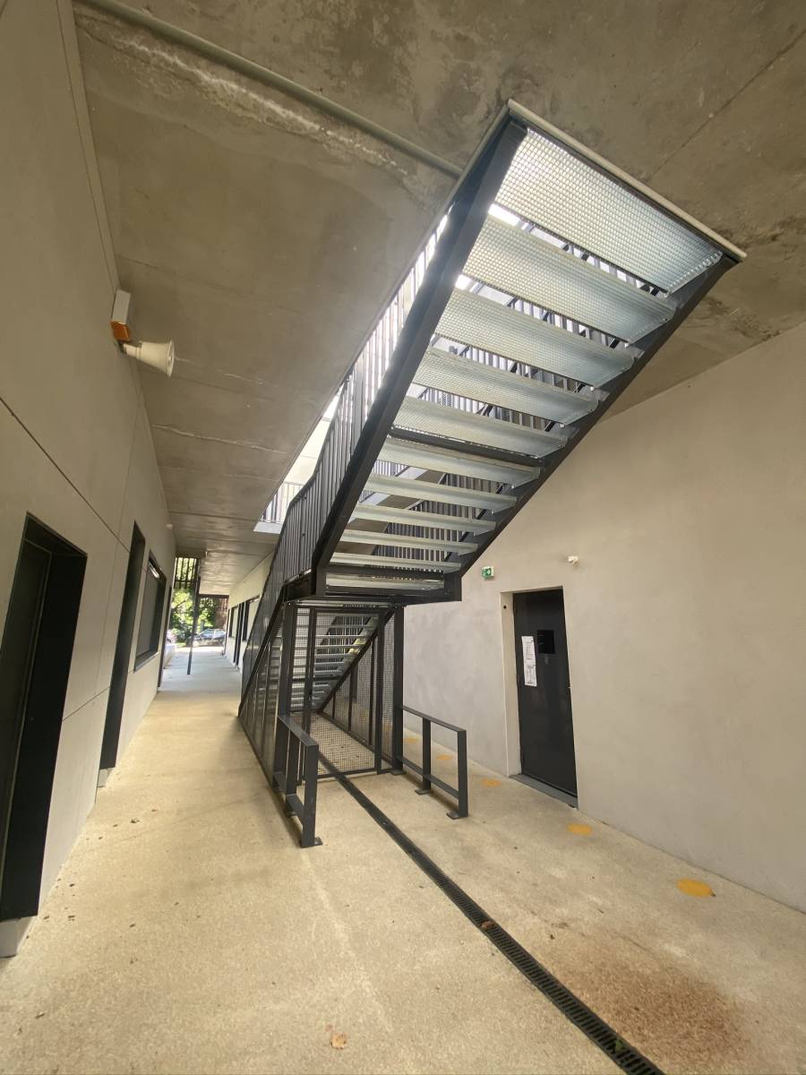 Pour ce chantier nous avons réalisé plusieurs ouvrages métalliques intégrant deux escaliers en acier avec des marches en acier galvanisé et leur garde-corps, une ossature double peau enveloppant le bâtiment, ainsi qu’une toiture en polycarbonate montée sur une charpente légère en tube acier.